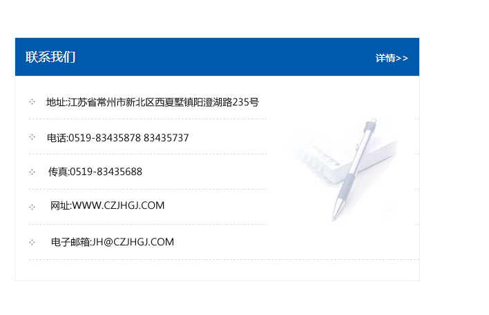 傳真:0519-83435688    郵編:213135    網(wǎng)址:WWW.czjhgj_com.ailinecology.com    電子郵箱:JH@czjhgj_com.ailinecology.com